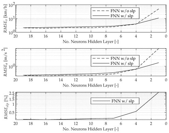 The same procedure is used to select the number of neurons for the hidden layers of the neural network. For the choice of a suitable number of neurons, the number of neurons in the hidden layers are reduced from values in the literature (Figure 8). Due to the convergence of velocity and acceleration, the parametrisation proposed in Table 4 (no. neurons hidden layer of 10) can be confirmed as suitable. As can be seen, the converges to ≈2 km/h, and the converges to ≈0.4 m/s for a prediction horizon of 10 s for the chosen test dataset.