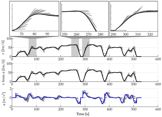 As shown in Figure 9, MC allow both a velocity and acceleration curve to be predicted, whereby the resulting velocity curve from the integrated acceleration has a slightly lower RMSE. Therefore, only velocities from the integrated acceleration signal are compared with actual velocity values in Table 5. The decisive factor here is how individual states in the real driving cycle, that are not included in the training cycles, are treated. In this work, the assumption of remaining in the current state is chosen. Thus, the constant acceleration provides better values than the assumption of a constant velocity due to the fact that the resulting velocity of constant acceleration is more realistic. This behaviour can be seen at t = 280 s and t = 380 s. Generally, the MC show best prediction accuracy in areas of low dynamics. In the case of an acceleration manoeuvre, however, such as occurs at t = 80 s, the transition to relatively constant velocity is only predicted correctly when the maximum velocity has almost been reached. Similar results can be seen during deceleration at t = 260 s, which is only correctly recognised after the braking process has started. Also, the starting process could only be predicted after the rise of speed (t = 290 s). Until this happens, a velocity of zero is predicted. However, constant velocity phases are always predicted from the MC properly. The MC deliver plausible results overall and prove to be suitable for the prediction of the velocity and acceleration.