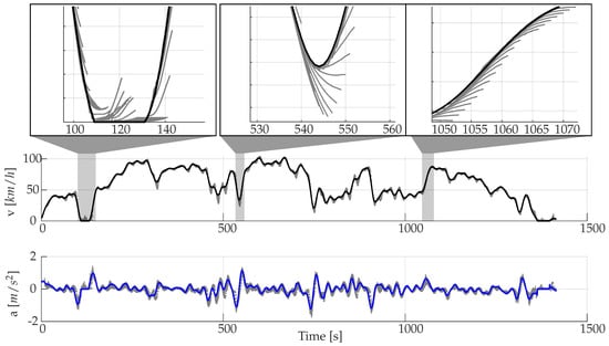 The optimal driving strategy determines the torque distribution between the different drives. In the case of a hybrid electric vehicle this includes the optimal interaction between the Electric Motor (EM) and the Internal Combustion Engine (ICE). In addition, there are other control variables, such as the On/Off state of the ICE []. Besides the distribution of torque to the various traction motors, the driving strategy can also determine the gear selection and—depending on the degree of automation of the vehicle—the velocity to be driven []. However, the focus of this paper will be on predicting driving profiles, which have been specified by real drivers.