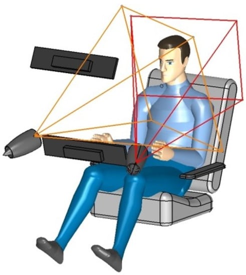 Schematic 3D view of the interior. The driver is facing the dashboard, including the two IR cameras. The overlapping viewing cones of both cameras are shown in orange and red. (Permission by Institute for Automotive Engineering).