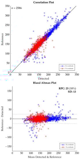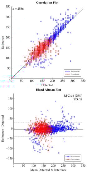 As already explained, the tracking was tested on downscaled versions of the videos to simulate lower resolution sensors. The following resolutions were tested: 382 × 288 (original size), 95 × 72 (1/16th of original size), 76 × 57 (1/25th), 47 × 36 (1/64th) and 31 × 24 (1/144th) pixel for comparison with thermopile arrays. While the reference is based on the original image size, the detected position on the downscaled image was upscaled to match the reference by multiplying the coordinates with the inverse downscale factor. Figure 5 and Figure 6 display the correlation and Bland–Altman plots for the detected and reference points, while X- and Y-coordinates (X: blue, Y: red) are displayed inside the same plot. Due to the image ratio and restricted movement of the body on the driver seat the Y-coordinates are limited to a smaller range, than the X-coordinates. In Figure 5 we can see the results of tracking using the original image size of 382 × 288 pixel.