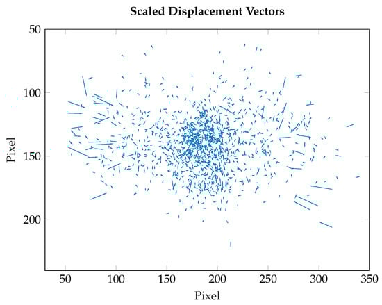 The vector plot illustrates the displacement of reference to detection points. Every vector starts at a reference and points towards the detected location. The length is scaled down by 2.5 to add the visibility of the vector field. The highest displacement is located at the left and right of the image border.