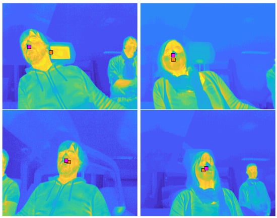Four colormapped LWIR pictures with reference (magenta) and detection (orange) points using the original image size of 382 × 288 pixel. Warm regions are displayed in yellow colour and colder regions are colored blue. In the first picture on the top left the headrest is heated up and the detected point is between the actual head and the heated area. The top left and bottom right picture show examples of people standing in the background.