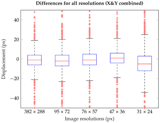 The Bland–Altman and correlation plots for the first three downscaled resolutions (95 × 72, 76 × 57 & 47 × 36 pixel) are omitted here, since they differ only minimally from the plots in Figure 5. The limits of agreement are around ±25 pixel. With an IFOV of about 2 per pixel, the approximated difference in an image plane is about 5 only considering the error in one coordinate direction, leading to an displacement of around 30% of a common head size, using a standard average head width of 153 []. The similarity is also visible in Figure 9. For that, we will focus on the upper and lower adjacents. The difference between these values is around 40 pixel for the first four boxplots and for the last it changes significantly to 59.
