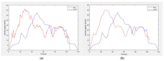 Comparison of IMU and GPS data for estimation of vehicle speed (km/h). (a) Without filtering (b) with filtering.