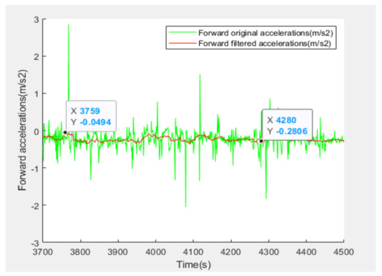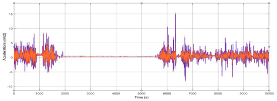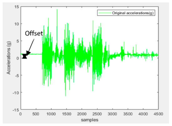 One of the most important factors for errors in IMU is the acquisition of unwanted vibration which can be caused by several mechanisms like engine vibration, road irregularities. Vibration dampers in the vehicles are not able to arrest low amplitude high-frequency vibrations which is the most important cause appearance of random data in +g and −g. Random vibrations are directly plotted and their average values are calculated. Offset error is calculated by plotting the IMU data as shown in Figure 3. The preliminary offset and sensor calibration is taken into consideration.