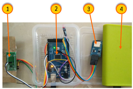 A data logger is developed for Through-the-Road parallel HEV scooter and data are recorded based on the electric, engine, and hybrid modes using the Bosch BMI-088 IMU sensor. Figure 5 shows the complete assembly of the IMU kit that is developed for recording the vehicle’s linear and angular accelerations with the programmable sampling rate. In Figure 5, module ‘1’ is the shuttle board for IMU chip BMI 088. The shuttle board includes an IMU chip and interfacing facility. Power supply and I2C pins are interfaced with the processor. Module ‘2’ is a microcontroller unit (MCU) that interfaced with IMU, SD card, and power supply. Module ‘3’ is the SD card record facility. Serial Peripheral Interface (SPI) is used for micro-SD card interfacing and data are recorded. Module ‘4’ is a power bank used to power the MCU module.