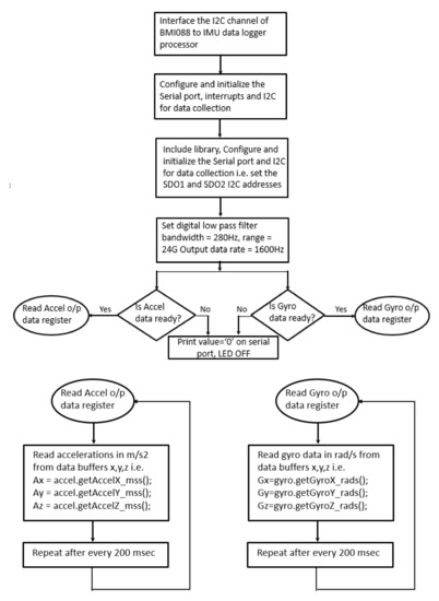 As mentioned above, IMU is capable to output the data with 2.5 to 1600 Hz. A serial Interface with a 12,900 baud rate is used to verify the data on the serial monitor. The serial monitor for the data indicates sample number, X, Y, Z accelerations in m/s2 followed by X, Y, Z angular displacements in degrees. An IMU sensor is used to estimate real-time vehicle state and velocity. In the HEV perspective, the drive cycle is used to find out covered distance and energy utilization for switching between the conventional engine and Motor. Figure 6 describes the programming methodology of the data logger. Libraries interrupt and the serial port is initialized. All the necessary programming registers for I2C addresses, bandwidth, and output data rate are configured. A serial port is used for the initial check for data sample records during functionality development to confirm that the data logging pattern and data calibration are done correctly. Later, only the SD card records the same data pattern in the file on the vehicle as shown in Figure 6. In this study, Ax subjects to lateral, Ay to forward, and Az to vertical accelerations. Accelerometer and Gyroscope are recorded every 200 ms. Data of all variables are later processed in a file to calculate vehicle speed in km/s.