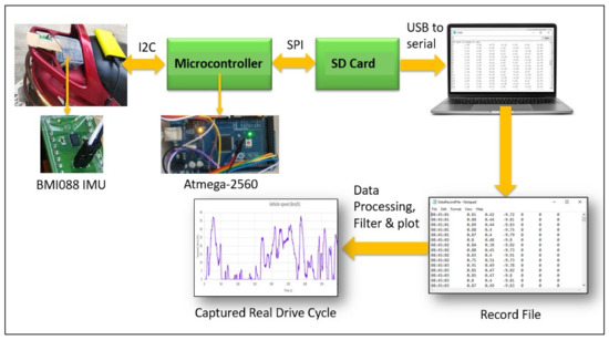 Figure 7 represents the methodology used for real-time drive cycle estimation from IMU. Data recorded by data logger at 8 Hz sampling rate is used for estimation of vehicle–road data characteristics. The sensor is calibrated in X, Y, and Z coordinates. IMU is interfaced with the Microcontroller through the I2C channel and the data are logged in the SD card by a firmware programming environment. While the data are logged into the SD card, every time an LED is programmed to blink so that it is easy to identify whether the data log is going on or facing any issues. Once the data are logged into the SD card for a known route, the data from the SD card is transferred to a computer for processing.