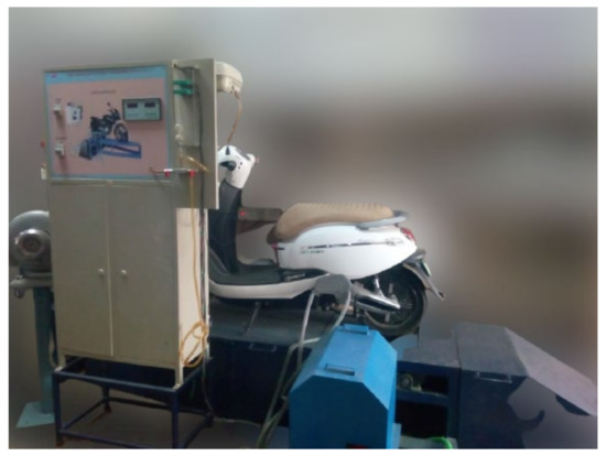 Energy utilization can be estimated in various ways. Using a fuel map table, the fuel consumption of the conventional engine can be estimated theoretically with drive velocity. The outputs of the estimations can be compared with the experimental fuel consumption data for calibration and to derive a correction factor. Generally, the experimental fuel consumption of the vehicle can be calculated by volumetric or by gravimetric measurement. For volumetric measurement, a standard 100 mL measuring jar will be connected to the carburetor and the distance covered for every 100 mL fuel consumption is found. Here, for fuel consumption measurements, the data are collected on a two-wheeler chassis dynamometer, and with the help of a burette, fuel consumption is found. Fuel maps are generated with different throttle openings and wheel rpms. In addition, on the test track, a 100 mL measuring jar is also used for fuel consumption estimation. On the same chassis dynamometer data are also collected on EV mode (for motor energy consumption). Figure 10 shows the two-wheeler chassis dynamometer used in this work to acquire the fuel map data.