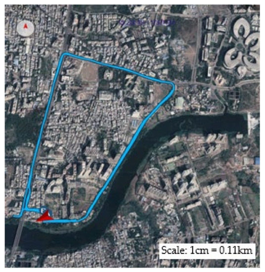 For better precision, an IMU is programmed with a higher sampling rate than smartphones can to record data in SD cards. For drive cycle estimation, the test route is selected and data are recorded using AN53 IMU data logger. The drive cycle extraction method is explained in Section 4. During the study, the vehicle movement is captured under various conditions like gradual acceleration, quick acceleration, deceleration, etc. [5,7,17]. Review shows that data loggers for below 0.5 kW EVs need to have a sampling rate from 1–3 Hz frequency to capture accurate vehicle dynamics. A too-high sampling rate increases the measurement noise and does not add any information. For this work, an 8 Hz sampling rate is selected for better estimations, and, accordingly, data are logged in SD card. As there is no specific drive cycle for EV and HEVs, the collected data which is the actual driving condition at a particular instant of the time is utilized for estimations, and the outputs are not compared with the standard driving cycle. For validation purposes, geographical distances are also calculated with the help of Google maps.