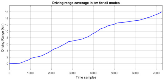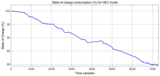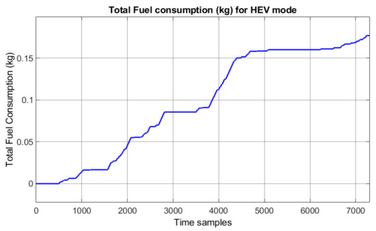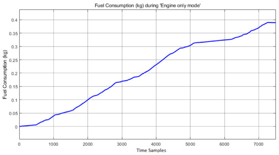 Figure 14 represents cumulative fuel consumption on engine mode for the entire inputted drive cycle. With an 8 Hz sampling rate, the data of 7300 samples are used for measurements and the graphs are plotted.