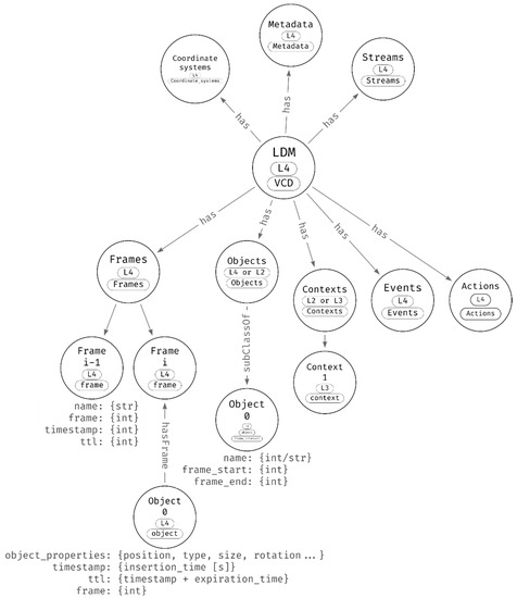 Furthermore, the main structural difference between OpenLABEL and the iLDM data model is related to the “relations”. While in the standard these are subclasses of “elements”, for the functional implementation of the iLDM, they are expressed as edges of the graph; that is, they are represented as relationships between nodes, since this approach allows for the construction of a semantically enriched data model. Therefore, our approach provides a mapping of the OpenLABEL information into a graph.