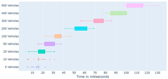 Box plot with insertion time into Neo4j in milliseconds of different number of vehicles.