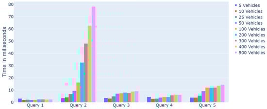 The response time results for each query with different numbers of vehicles can be seen in Figure 11: