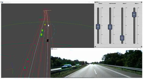 For this test, a sequence of the KITTI data set inserted into the iLDM was used along with RTMaps as the real-time processing framework. In Figure 12, we can visualise three different windows including a 3D visualisation of objects retrieved from the iLDM in a given frame, a set of sliders for real-time adjustment of the VDS input thresholds and an image viewer of the corresponding KITTI camera image.