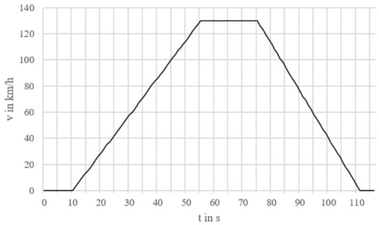 A constant required energy demand is achieved by holding the maximum speed for different lengths of time, as the resistance power is increasing with higher velocities. For the 35 km/h profile, the maximum speed is thus held for significantly longer than for the 130 km/h profile. The 130 km/h velocity v profile in km/h is shown in Figure 1 over the time t.