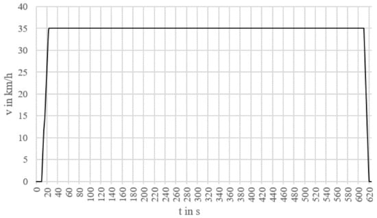 Figure 2 shows the 35 km/h profile over the time t. As described, the initial acceleration and braking deceleration is of the same magnitude for both presented profiles. A comparison of the two presented profiles shows the difference in the duration of the maximum speed held constant.