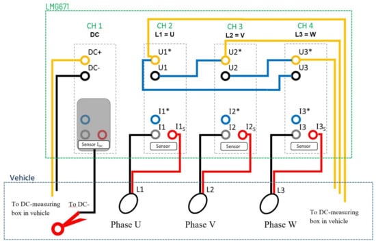 The measured currents and voltages are used to calculate the electric power between the power electronics and the electric engine and the power between the power electronics and the high-voltage battery. In analogy to the setup of CH1 illustrated in Figure 3, the current and voltage of the 12 V low-voltage system is measured on channel 5 (CH5) of the LMG671 to calculate the power consumption of the 12 V on-board power supply . This is important as the DC/DC (high voltage > 60 V to low voltage ≤ 12 V) converter may charge the 12 V battery during the testing. This energy has to be taken into account for the computation of the energy balance.