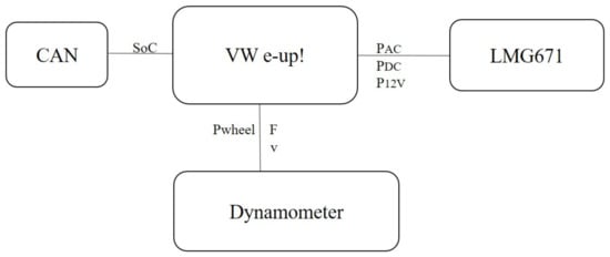 The CAN-data of the VW e-Up is recorded while driving. The overal measurement setup 1 is shown schematically in Figure 4. As described the LMG671 is connected to the vehicle and measures voltages and currents which enable the calculation of , and . The only necessary quantity from the CAN-bus is the state of charge (SoC) from the e-Up battery management system. The dynamometer provides the wheel force F and the dynamometer roller velocity v which is assumed to be the vehicle velocity. So for this test setup wheel slip is neglected as driving power levels are low, this is valid. With this information, a wheel power can be calculated using F and v.