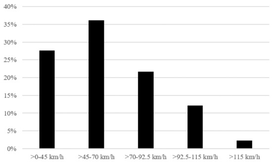 The speed-dependent energy consumption data can be applied to clustered speed data from real-driving profiles. Figure 8 presents clustered data from a route including city driving, interurban driving and expressways. The route from Radolfzell (Lake Constance) to Weingarten in Baden-Württemberg Germany is 86 km long. The route was driven with summer tires at about 25 °C outdoor temperature. This temperature is close to the ambient temperatures during the passed chassis dynamometer tests. Velocities lower than 70 km/h do have a share of more than 60% of the overall time. More than 14% of the time, the velocity was larger than 92.5 km/h.