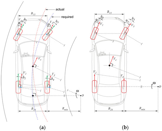 Then, the rear wheels’ angular speeds ωw4, ωw2 can be tied with the parameters of the turn kinematics as: