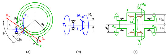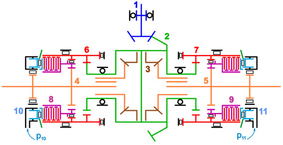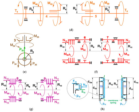 It is evident that in the vector T from Equation (29), M68 = −M86 and M79 = −M97, which allows considering only the driven parts. Frictional moments in clutches are functions of the design parameters and normal forces N10, N11. That is,