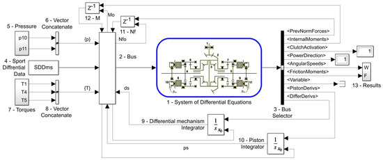 Block 3 (Bus Selector) expands the complex output by the corresponding signal names. Namely, signals denote: <PrevNormForces> is a row vector of compression forces in friction clutches from previous integration step; <InternalMoments> is a vector of internal moments used for detecting clutches’ operating modes and states of transmitting elements; <ClutchActivation> is a row vector of frictional couplings 6–8 and 7–9 modes taking values 0—inactive and 1—activated; <PowerDirection> is the direction of the external power flow for the differential mechanism: 1 (direct) and -1 (reverse); <AngularSpeeds> is a column vector of angular velocities according to Equation (32); <FrictionMoments> is a row vector of frictional moments’ values; <Variable> is a reserve variable for displaying any other data while testing the model; <PistonDerivs> are the derivatives of hydraulic (translational elements) clutches’ states; <DifferDerivs> are the derivatives of the differential (rotational) components’ states. All the needed information about the differential components’ physical and geometric characteristics is collected in the SDDms structure and transmitted through block 4—Sport Differential Data.