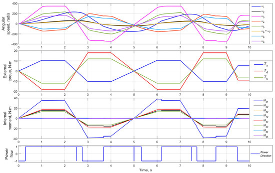 Note that the instantaneous switch in Figure 7 occurs at the time of mutual intersection of the external and internal loads in the nodes with zero values. The regime change means switching between equations with different efficiency vectors. From the point of view of zero loads, the computations of the dynamics equations for a given moment are the same. To eliminate this phenomenon, it is necessary to use efficiencies depending on torques and kinematics, which complicates the model and is insignificant for speed modes. Further, most models proposed in the literature do not use mode switching at all and often neglect mechanical efficiency.