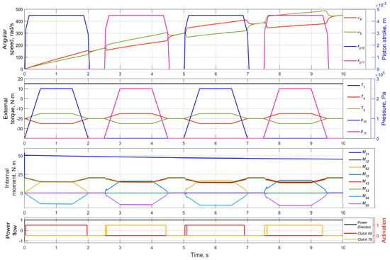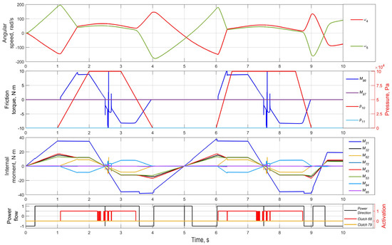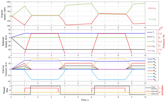 Consider now an option of activating one of the differential’s clutches (Figure 8) for the same external loading conditions as in Figure 7. Proceeding from the fact that a larger external resistance torque passes through axle 4, the pressure increase p10 can be set while p11 remains zero (Figure 8, Pressure). Only ω4 and ω5 angular speeds are reflected as the output. The pressure increase phases are accompanied by the friction torque M86 (M97 = 0 because of p11 = 0). In the phase of positive values, this friction torque adds power to shaft 4 with a larger load, causing its angular speed ω4 to exceed the ω5 one, unlike the situation in Figure 7. The internal moments M62 and M84 appear in the opposite phase, revealing their possible leading/driven states when the clutch 6–8 is activated. Thus, in contrast to the situation in Figure 7, the torque and speed output parameters are redistributed, and the angular speed of a more loaded shaft can exceed that of a less loaded shaft.