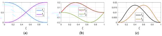 Basis functions. Let us consider an i-th final element with 3 DOF in a node along the x-coordinate based on a 5th-order polynomial [], the length of which equals Li. If x = Liξ, then dx = Lidξ, where parameter ξ [0, 1]. The system of basis functions for an FE with Li = 1 (Figure 1) and its three derivatives yield