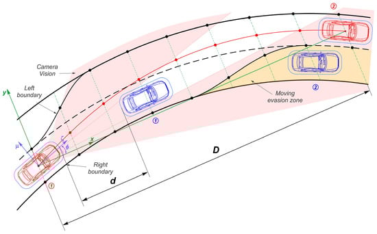 Figure 2 shows the generalized motion case of an AV guided by computer vision within the roadway boundaries and detecting moving obstacles. Let us assume that a road is represented by a curved section and has at least two lanes in one direction, which allows maneuvering between the lanes, including avoiding obstacles. The initial layout of vehicles corresponds to Position 1, where a need for planning the AV displacement to Position 2 emerges. Considering the section curvature, this position can be determined if sufficient visibility is ensured. We also assume that an invisible part within the outer roadway boundaries in front of the impeding vehicle is homogeneous (monotonic curvature) and can be virtually rebuilt based on satisfactory information before and behind a visibility break. Let the current position of the AV be characterized by the direction of the axis ζ of the moving coordinate system ζμ tangentially to the midline of the initial traffic lane. Then, the destination point corresponding to Position 2 is defined under the angle -ϕ to the ζ axis. The current instantaneous position can be taken as the initial relative to the new global coordinate system xy. Both the lane boundaries and the movement of an impeding vehicle are redefined. Thus, the AV must realize a displacement D within the safety boundaries, avoiding the moving obstacle from an initial distance d between the vehicles.