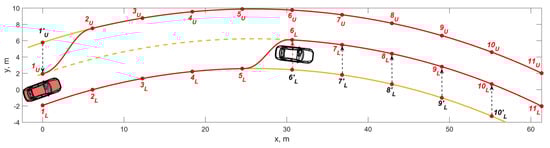 Determining the difference in stopping distances after substituting the value sets in Equation (14), we obtain the minimum allowable initial distance between the vehicles, considering the guaranteed safe clearance of 1.5 m: Δsb = 12.5 m. Thus, neglecting the curvature, the initial position of the impeding vehicle’s mass center relative to the initial position of the AV can be estimated as 15 m along the lane. According to the calculations, the AV needs 30.4 m of stopping distance, and an impeding vehicle needs 19.6 m. Then, the final position of the impeding vehicle corresponds to the coordinate x ≈ 32 m. Consequently, the restriction of allowable space relative to the moving obstacle on the lane is limited (Figure 3) by transiting the lower node 6’L of the outer boundary to the node 6L of the lane’s inner boundary. Since the final position of the AV is set in advance and corresponds to using the second lane, the admissible space is constricted by switching nodes 7’L–11’L to nodes 7L–11L, respectively. In the final position, the assessment of the affordable area is repeated.