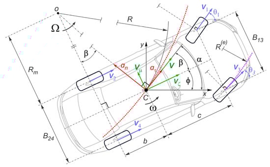 The MATLAB code using the basic nonlinear optimization function fmincon was composed to test the proposed approach. Thus, several planning trajectories and speeds were performed. Table 2 shows the primary necessary physical, kinematic, and geometric data (Figure 4) of the vehicle Audi A4 Quattro [].