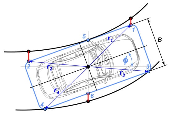 When planning the trajectory and its derivatives, combining the vehicle safety zone with the allowable motion area’s boundaries is necessary. Figure 5 depicts the possible cases limiting the safe movement near the borders, expecting that their curvature provides the same sign within the overall vehicle length.