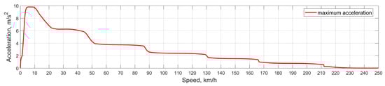 These restrictions should be included in the nonlinear optimization constraints, which allows proceeding from the vehicle’s physical capabilities depending on the peed mode. The characteristic can be represented by interpolation for the current calculations. Thus, in the checkpoints within the intervals and in each node, the conditions must be satisfied: