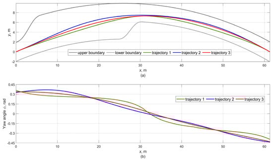 Using the criteria and technique of Section 3, let us consider the possible trajectories shown in Figure 7a and the curves of the vehicle yaw angle in Figure 7b. Each curve corresponds to a different combination of weights wy Equation (49): wy1—trajectory 1, wy2—trajectory 2, wy3—trajectory 3.