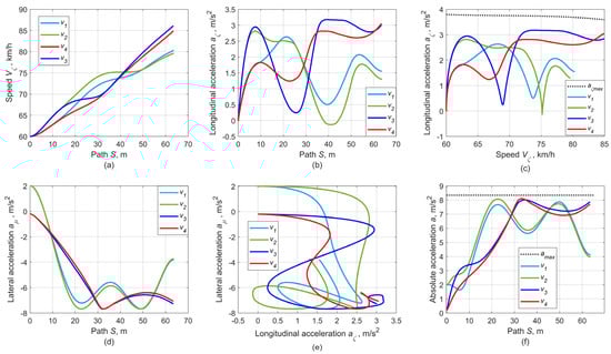 For optimizing the speed distribution with the SQP algorithm [], trajectories 2 and 3 were used to provide a compromise between smoothness and average curvature, which is essential to forecast stability. Thus, it is possible to form four variants of speed planning by two for each of the found trajectories 2 and 3. Variants v1, v2 are based on trajectory 2, and v3, v4—on trajectory 3, respectively (Figure 8). For these options, the following combinations of weighting coefficients wv of Equation (92) are proposed: