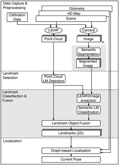 Figure 1 shows the information flow in the localization system. We used the graph-based method for vehicle self-localization from [] as a baseline method. In Figure 1, the baseline method is presented on the left side. Only LiDAR information is used to detect landmarks based on geometry. These landmarks are co-registered within a 2D map.