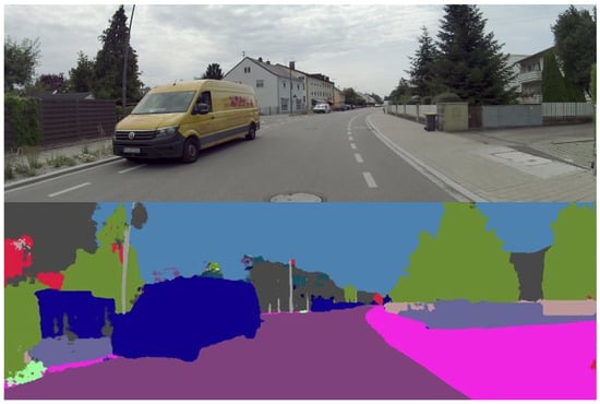 The right path shows the processing pipeline for landmark classification with the help of camera information and sensor data fusion. The images are semantically segmented with an adapted version of ERFNet []. An exemplary output of the segmentation network is shown in Figure 2. The colors represent the respective classes and can be seen as a per-pixel classification of the whole image. The same geometry-based detectors as in the baseline method are used, but now, the detections are classified with camera information by projection into the segmented image obtained by the camera. By combining the geometry information from the LiDAR and the class information from the semantic segmentation, a layered classification model was developed. This is presented in Section 3.2. The semantic landmark classification is further presented in Section 3.3.