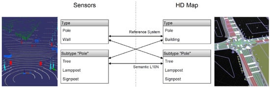 The layered model also enables map matches between different levels of detail on the sensor and map side represented by the diagonal arrows. One possibility is a localization system with semantic information matching against an HD map with only geometric landmark representations. The other possibility is a LiDAR-only localization system using an HD map with extended landmark types. If the sensor system lacks cameras and no classification is performed, a detected “Pole”-type landmark without semantic classification can either be matched to a “Tree” or a “Sign post” subtype marked in the map.