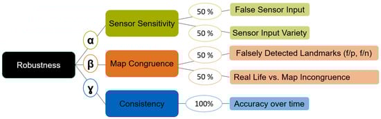 The International Standard for Systems and Software Engineering defines robustness as “the degree to which a system or component can function correctly in the presence of invalid inputs or stressful environmental conditions” []. Based on this definition and the inputs from [,] as described in Section 2, a specific robustness definition approach for localization systems is defined. The three key indicators, namely “correct function”, “invalid inputs”, and “stressful environmental conditions”, serve as the basis of the robustness evaluation in this work.