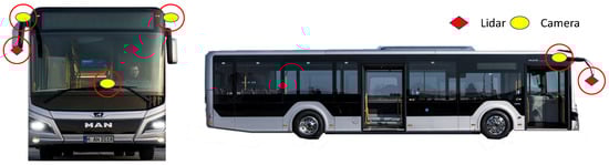 The methods from Section 3.3 were implemented for real-time use in a 12 m-long MAN Lion’s City bus, which served as a test vehicle. This vehicle is equipped with various sensor types. The main sensors used in this work are a 32-layered rotating laser scanner and cameras with a resolution of 2.3 MP and a horizontal field of view (FOV) of 120°. The mounting positions are shown in Figure 6. The laser scanner was mounted to the front right of the vehicle to perceive a 270° FOV to the front and right of the bus. Three cameras were mounted facing the front, right, and left. Furthermore, the vehicle is equipped with a real-time kinematic (RTK) system, which consists of a GNSS sensor and acceleration sensors. The algorithms were programmed in C++ and make use of the Point Cloud Library (PCL) and OpenCV. The modules were executed on industrial PCs with an x86 architecture and on an NVIDIA AGX Xavier with an ARM architecture. This system is capable of giving the current pose within a few centimeters and was used as a reference system for our localization.