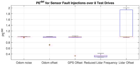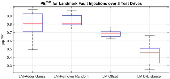 All nine perturbations were deployed on all test drives. In Section 5, we presented the error values for the respective fault injections, as well as their distributions over the different test drives. From the small changes in landmark detections after inserting offsets or Gaussian noise to odometry or the GPS signal, we derived a high resilience of the system under test for these system errors. In contrast to that, changes to the LiDAR inputs had a high influence on the detection performance. Reducing the frequency of the sensor reduced the number of measurements and, therefore, also the number of detections. Defining every landmark detection as a constraint to the current pose, this also led to less confirmations for the pose estimate. The same holds for limiting the range of the sensors. In reality, this might be the case in bad weather situations such as fog or heavy rain. Figure 8 shows not only that the variance of the fault injection was high, but also the number of successful matches was the lowest. In the baseline system, the LiDAR scanner was the only sensor used, so the impact on the whole system was high. By using redundant sensors or different sensor modalities, the robustness is expected to be higher.