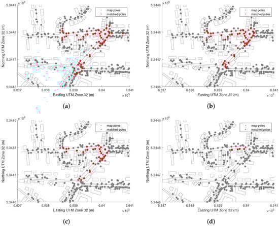 Example for the number of matched pole landmarks with different levels of range limitation for detections. The red dots are the matched landmarks over the course of Test Drive 02, whereas the grey dots and lines represent the HD map. (a) Baseline. (b) Maximum range 30 m. (c) Maximum range 20 m. (d) Maximum range 10 m.