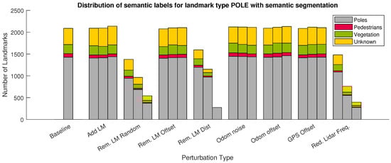 The perturbation injections from Section 4.3 were performed also on a localization system with the semantic classification of landmarks. For the semantic classification, LiDAR, as well as cameras were used. As this work highlights the semantic classification of pole-like landmarks, only landmarks with geometric type “Pole” were considered. Furthermore, the LiDAR’s field of view was not fully covered by the camera image. Landmarks that were not in the camera image cannot be classified and, therefore, were considered as type “Pole” and subtype “Pole” (Table 1).