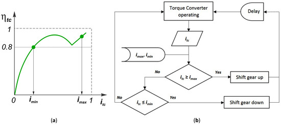 We0 limits the minimum stable idle speed and is a constant value corresponding to 250 rpm. Wl is a dynamic variable that memorizes a value of engine angular speed a bit later than the TC clutch locking up. dWl restricts the engine speed We reduction, relative to the recently set value Wl. i is a one-dimensional array of values setting the critical kinematic ratio for each gear. The values are not equal and determine the adjustments for the general shifting strategy. imin sets the lower permissible value of the TC’s kinematic ratio for gears higher than first; this is one value in this algorithm. However, as in the case for i, an array may be specified, ensuring an individual adjustment of the conditions for downshifting. ilc is the critical value of the TC’s kinematic ratio for the locking moment at sixth gear.