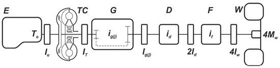 Note that the peak surges inevitably appear when gear shifting, due to the absolute rigidity of transmission elements’ and tire’s models. This effect is caused by instantly changing the ratio and inertia moments in the transmission. These impulses in the actual conditions are mitigated with the drivetrain parts’ flexibility during the automatic gearbox transient processes and are due to the tire tangential elasticity.