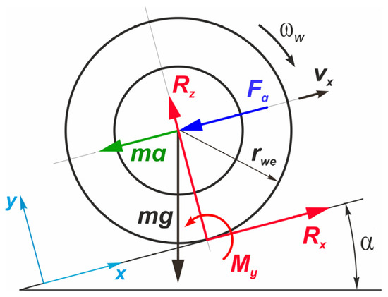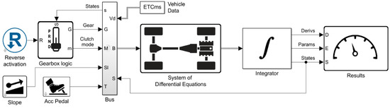 The system of differential equations Equations (5), (19), and (51), as well as the equations of power and kinematic interaction, are arranged in the System of Differential Equations block transmitting the states’ derivatives and a set of additional necessary parameters through the output bus. In the Integrator block at each loop step, the Cauchy problem is numerically solved for the system of nonlinear differential equations. After being integrated, the States are routed to the corresponding central data bus to be used at the next step of calculating derivatives. The States, Derivatives, and Parameters are sent to the Results block for processing and logging.