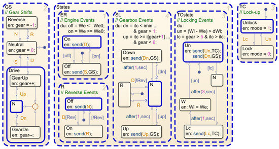 The order of executing parallel charts. The priority of chart execution significantly affects the occurrence order of control events. Thus, the States chart is executed first, followed by the GS and TC switching charts. Within the States chart, the hierarchy is also essential, following the order in which the aggregates are managed. Thus, the ER chart is executed first, as it is responsible for the sufficient engine speed to start moving. The second is the R chart, which is responsible for the reverse. The third is the TCstate chart, which is responsible for locking the TC’s clutch. The last one is executed by the SL chart, which is responsible for the up/down of the forward gears. In this order, there are no contradictions between the charts, and the general algorithm works stably.
